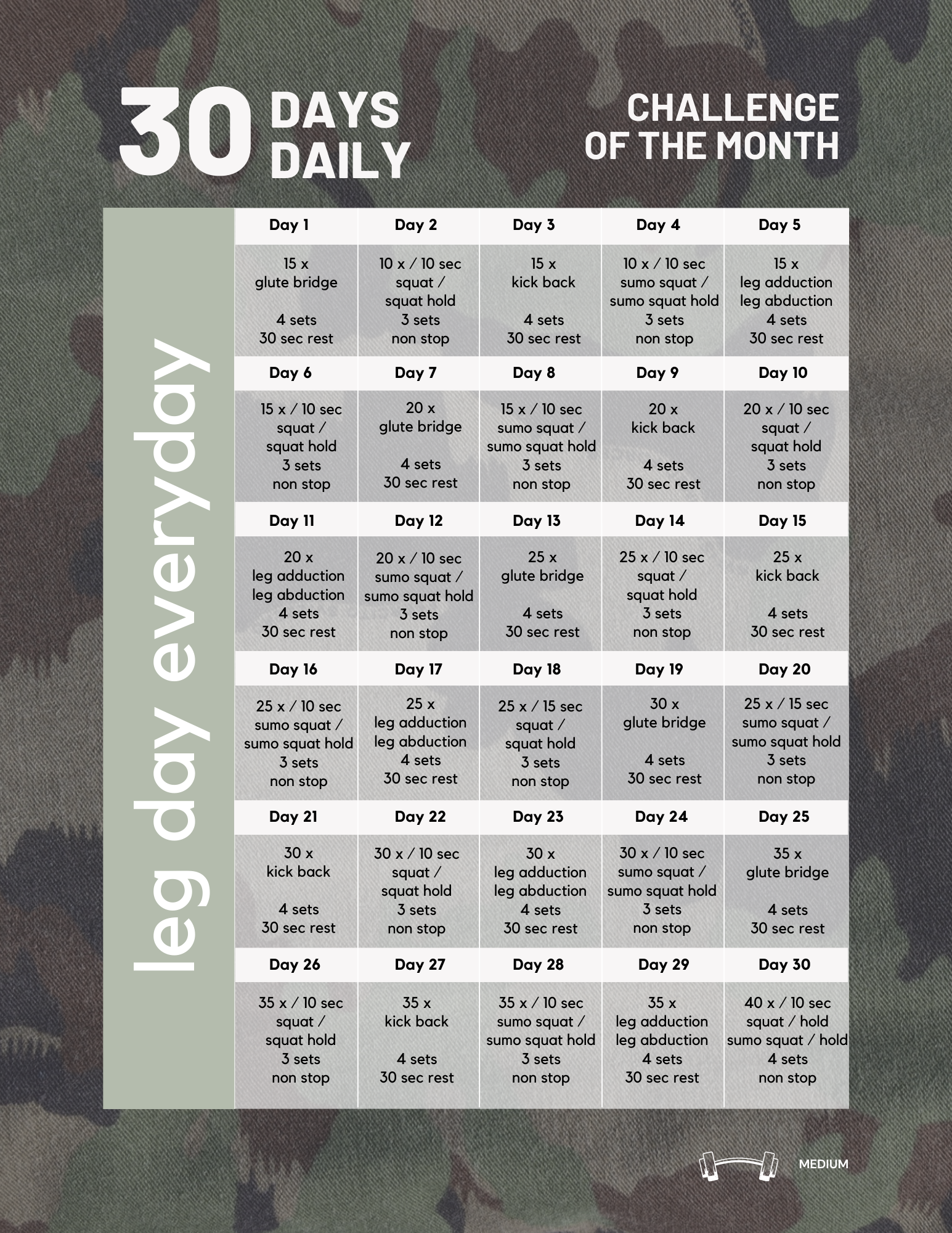 Sollevare e abbassare il bacino nella posizione della spalla - glute bridge / flessione delle ginocchia - squat / sollevare e abbassare la gamba in una posizione a quattro piedi - kick-back / squat ampio - sumo squat / sollevamento e abbassamento della gamba inferiore/superiore in posizione laterale - leg adduction/abduction
