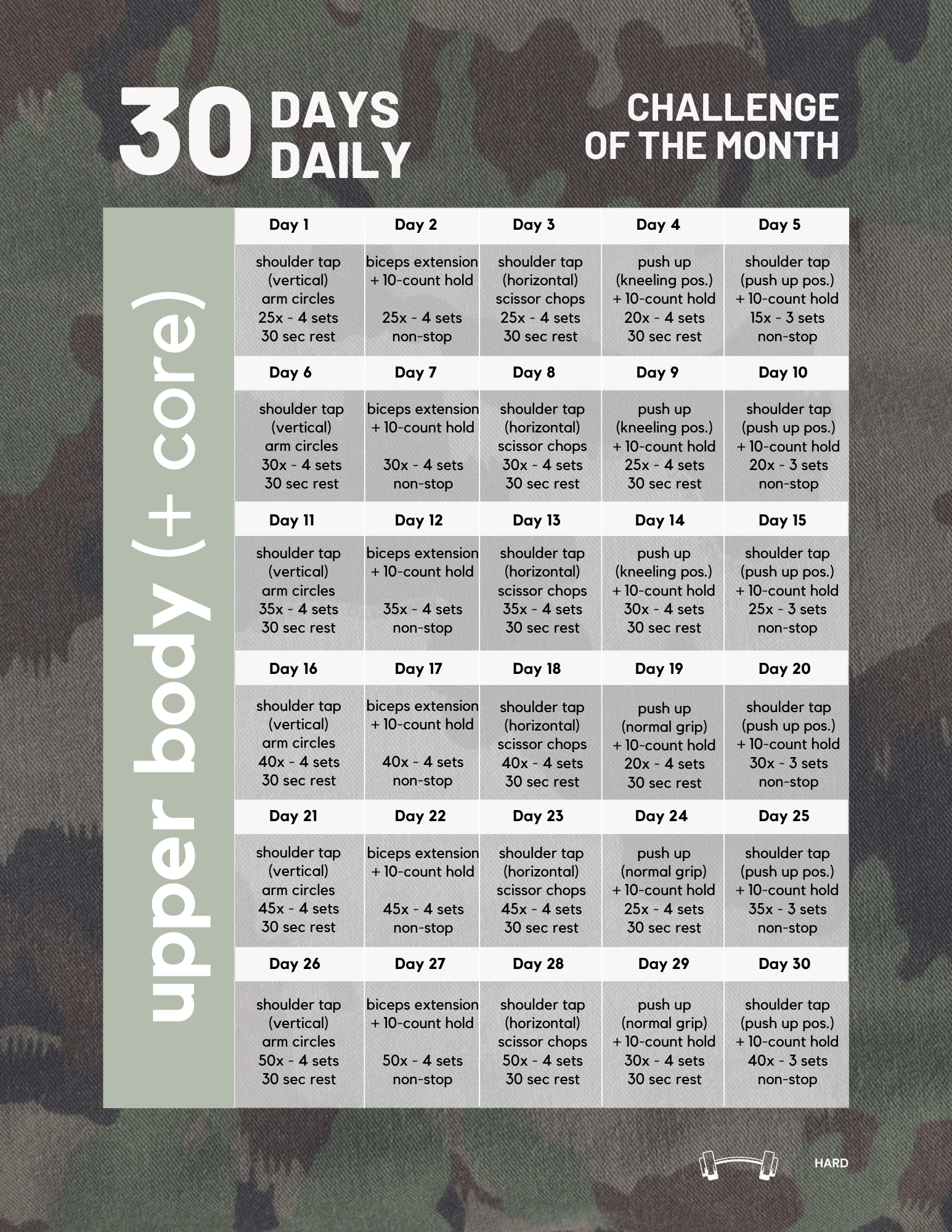 Portare le mani alle spalle stando in piedi o in posizione di flessione (shoulder tap) / estensione e flessione delle bracia in posiione eretta (biceps extension) / flessioni (push up)